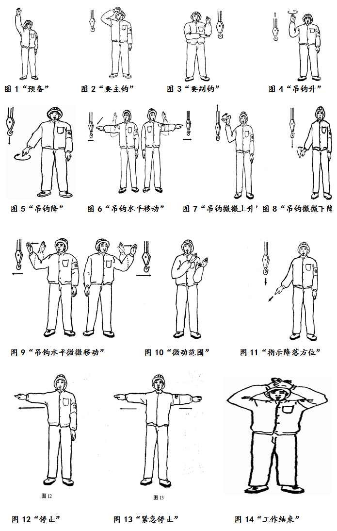 9.“吊鉤水平微微移動”:小臂向側(cè)上方自然伸出,五指并攏手心朝外,朝負載應(yīng)運行的方向,重復(fù)做緩慢的水平運動(圖9)